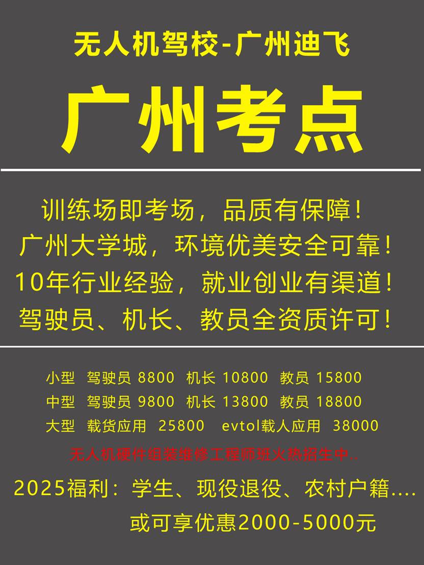 迪飛無人機駕校是廣州迪飛無人機科技有限公司與相關院校及企業合作成立專們針對無人機駕駛執照及無人機行業應用培訓的基地,總部位于廣州大學城智慧谷,交通便利,環境優美,學術氛圍濃厚,公司擁有經航管處批準的2萬平方米的飛行空域,可用于各類無人機的飛行測試和飛行教學,已成為多家院校無人機專業校外實訓基地。